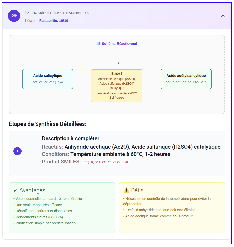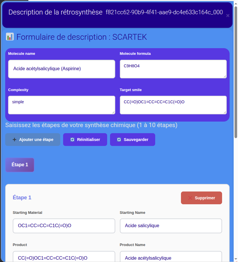 Ce service a été obtenu en réalisant la mise en ligne des scripts de AiZynthFinder déposés sur Github (lien). Ces scripts ont été rendus accessibles et simples d’utilisation suite à une interfaçage avec des web services.